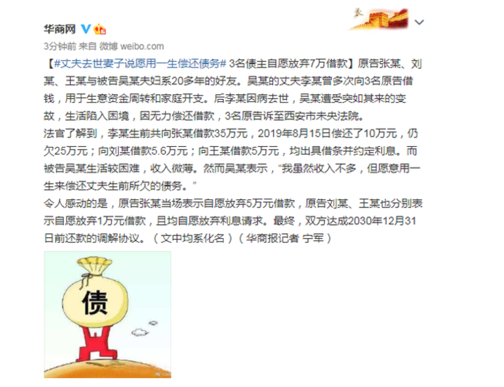 原标题:丈夫去世妻子说愿用一生偿还债务 3名债主自愿放弃7万借款原告张某、刘某、王某与被告吴某夫妇系20多年的好友。吴某的丈夫李某曾多次向3名原告借钱,用于生意资金周转和家庭开支。后李某因病去世,吴某
