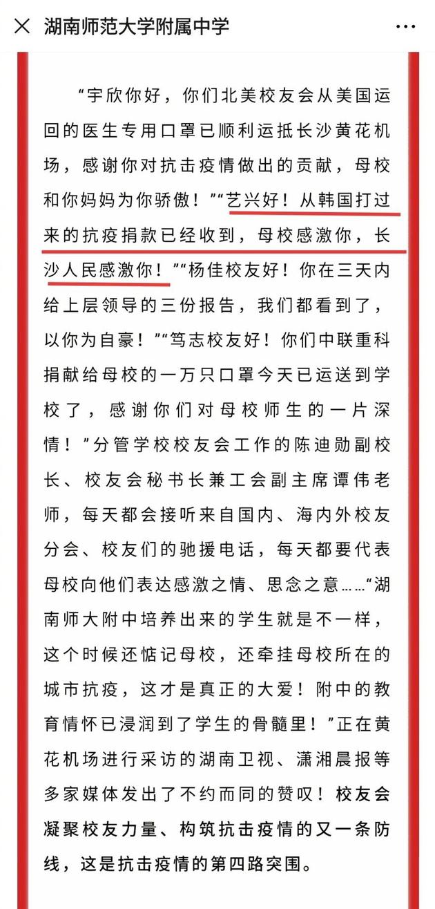 3月3日,张艺兴曾就读的高中湖南师范大学附属中学发布公众号文章,内容中提到:“艺兴好!从韩国打来的抗疫捐款已经收到,母校感激你,长沙人民感激你!”粉丝纷纷留言:“捐