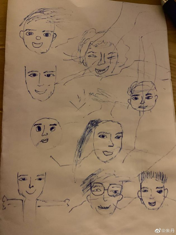 8月24日,朱丹微博晒出一张画,配文:“被我女儿逼成了灵魂画手,哈哈…她还说:妈妈,好厉害。”画中满是人物的头像,画风成谜。