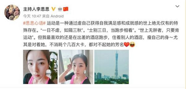 她表示“运动是一种通过虐自己获得自我满足感和成就感的世上绝无仅有的特殊存在。一日不虐,如隔三秋。士别三日,当跑步相看。世上无胖者,只要肯运动。”同时她还表示喜欢在出差的酒店里跑步,认为“不消耗个几百大卡,都对不起她的芳名”。从李思思的言语中可以看出她非常享受运动带来的乐趣。此动态一出,网友纷纷表示:“素颜还是那么的美”、“运动女神!”。
