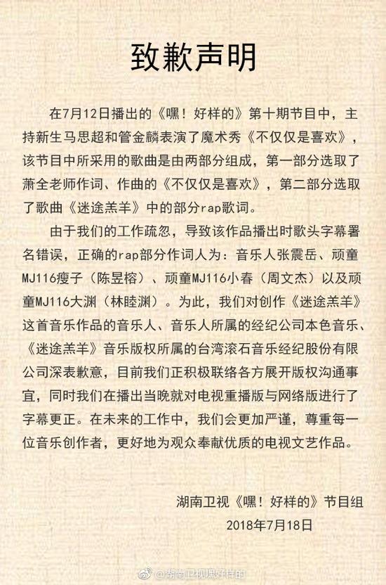 18日,湖南卫视《嘿!好样的》节目组就侵权使用了张震岳、頑童MJ116的歌曲《迷途羔羊》中部分rap歌词一事发表了致歉声明,称由于工作疏忽导致歌头字幕署名错误,现已对字幕进行了更正,正在积极联络各方展开版权沟通事宜。
