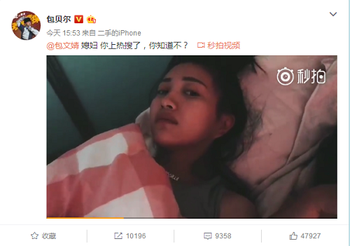 随后不久,包贝尔也在微博发了一条视频,疑似回应,内容为“包贝尔:媳妇,你上热搜了,你知道嘛? 包文婧:不知道。包贝尔:有人骂你是智障,不会算数,你知道嘛? 包文婧:那咋办”,包文婧面对包贝尔的问题也是实力诠释了一脸懵逼四个字。不少网友替包贝尔担心:包贝尔,你怎么娶了这样的老婆?也有不少人调侃包贝尔的坑妻属性。
