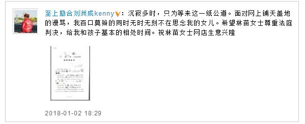1月2日,刘洲成上传了民事判决书。判决书中表示,原告林苗未举证被告刘洲成存在对小孩实施家庭暴力等行为,被告依法享有探望小孩的权利。原告主张减少被告的探望时间理据不足,本院不予采纳。