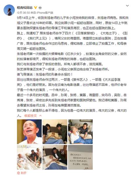 田壮壮跟朱旭老师合作过两次,他们是好朋友。在他眼里,老爷子是“一个伟大的演员,一个伟大的人”。因为在云南为电影选景,田壮壮一时赶不回来,不过,程青松透露,听闻老爷子离世的消息,壮壮导演在微信语音里哭了,他表示,今日要赶回北京,送朱旭最后一程。
