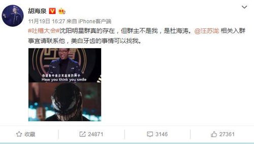11月19日,胡海泉在个人社交平台发文回应汪苏泷提及的沈阳明星群一事,表示“沈阳明星群真的存在,但群主不是我,是杜海涛,汪苏泷相关入群事宜请联系他。”胡海泉还配上了自己和毒液对比的照片,调侃汪苏泷美白牙齿可以找他。